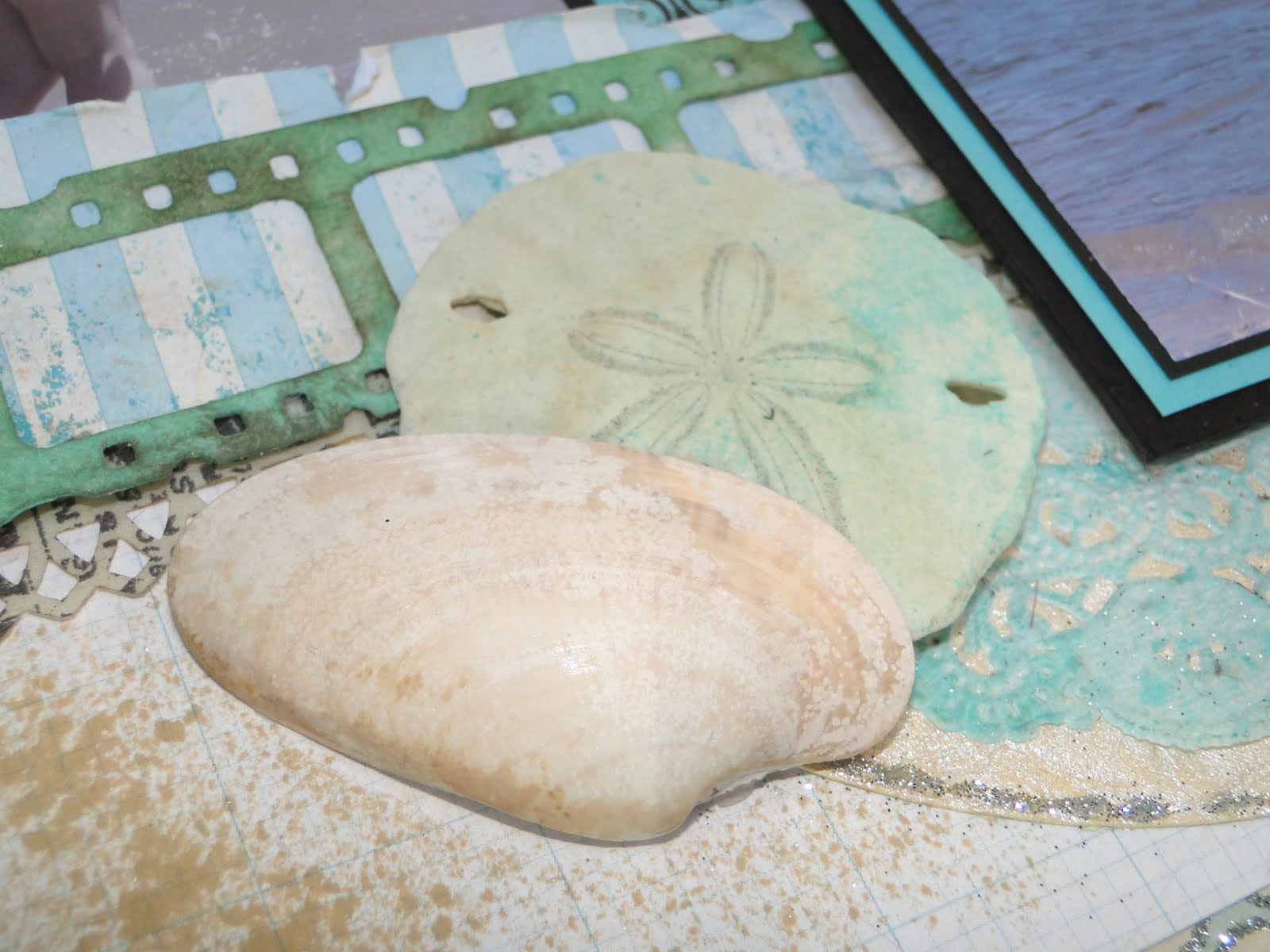 I dug thru the stash and we have a jar full of shells and sand dollars we've collected over many summers. Some are from Maine and some are from west Florida. The sand dollar was broken, chipped and didn't "bleach" out after drying. So, I spritzed it with some more glimmer mist! It looked cool! I also took a doily and layered it on some sandy pearl cardstock. Taking my cue from Lost & Found I add a bit of glitter around the edge.